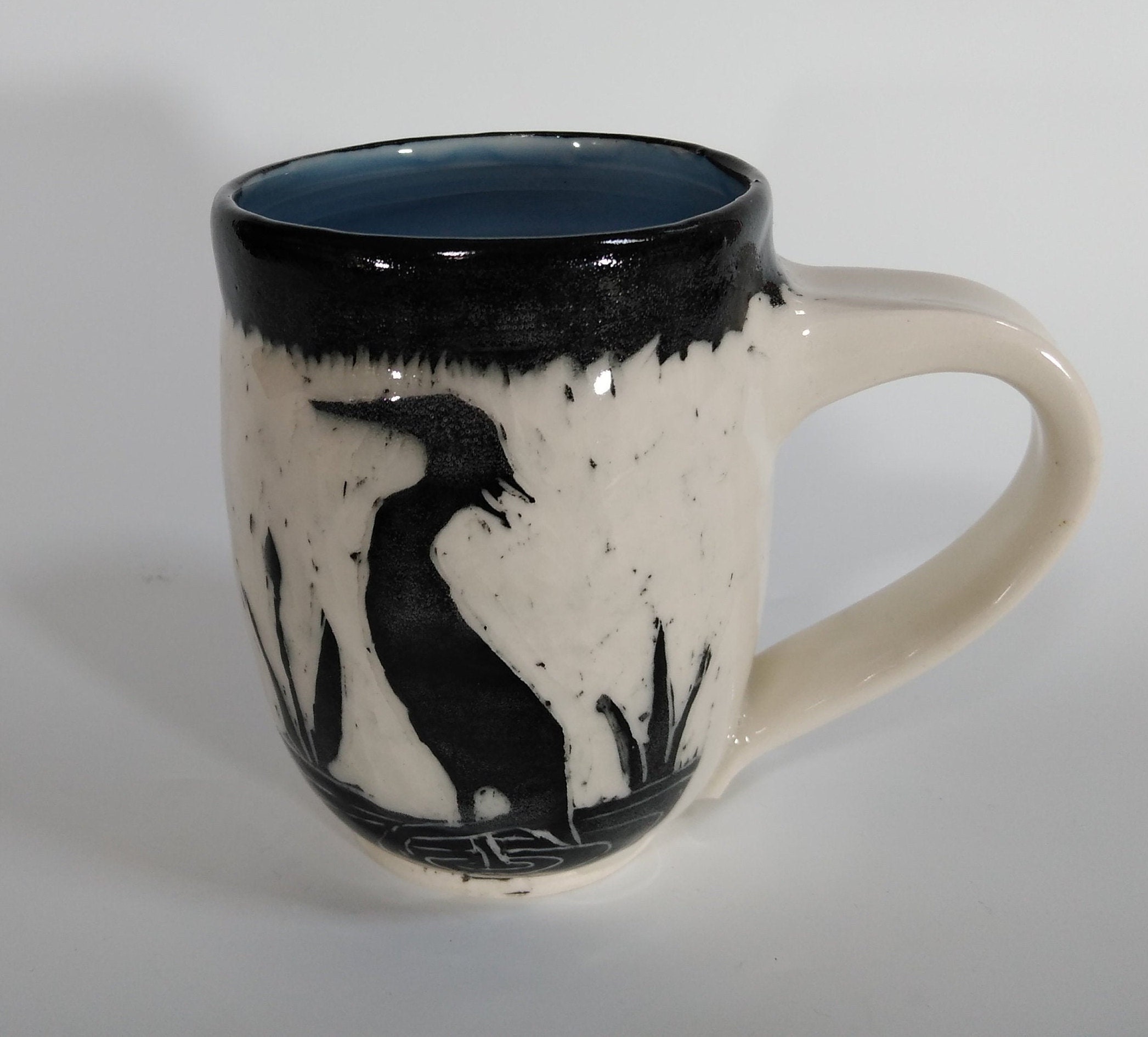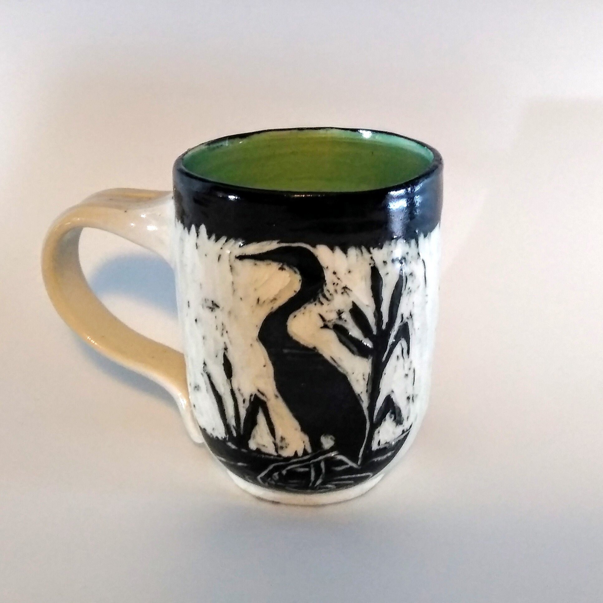 Wheel thrown porcelain, carved black slip, pulled handle. clear exterior glaze, fired to cone 6