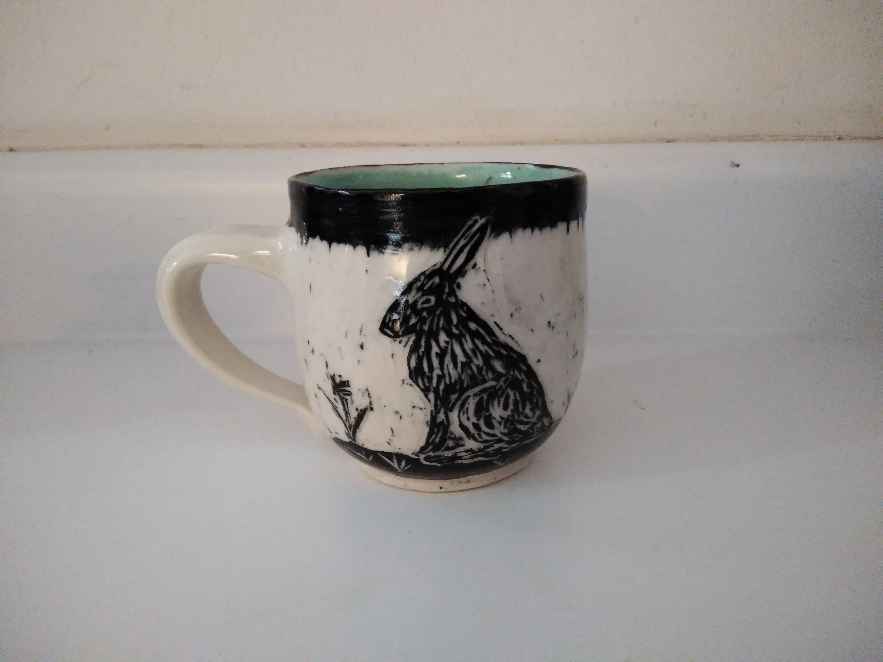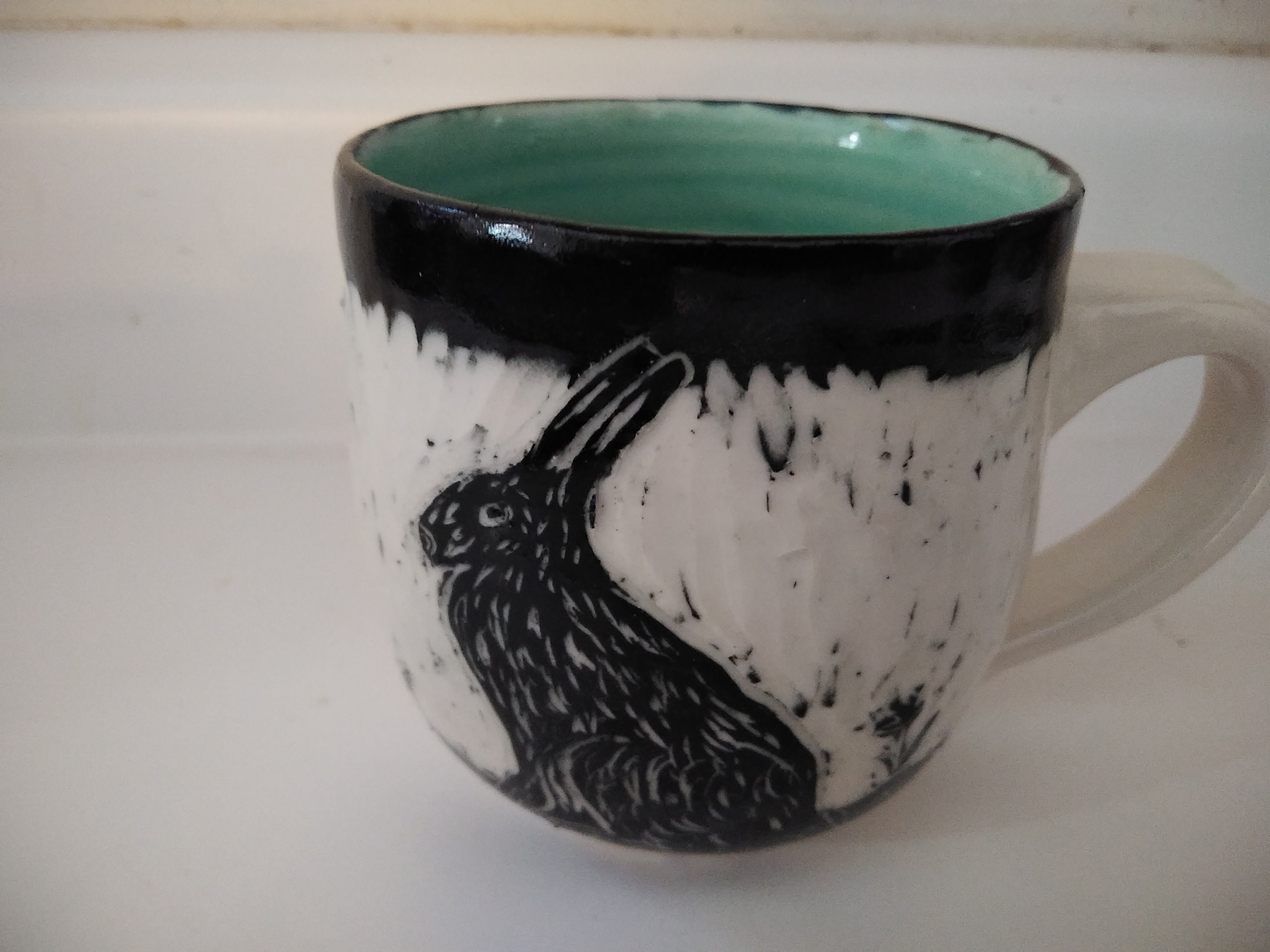 Wheel thrown porcelain carved black slip, pulled handle, clear exterior glaze, celadon interior. Fired to cone 6